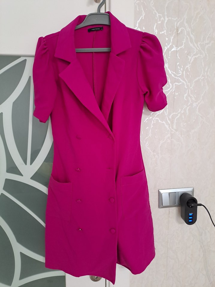 Pembe renkte, diz boyu kadın ceket Düğmeli, kısa kollu ve kesik yaka detaylı, ofis stiline uygun.