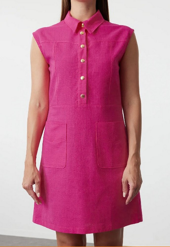Düğmeli, yakalı ve cepli pembe midi elbise. Kolsuz ve normal kesim, keten görünümlü mini dokuma elbise günlük kullanıma uygundur.