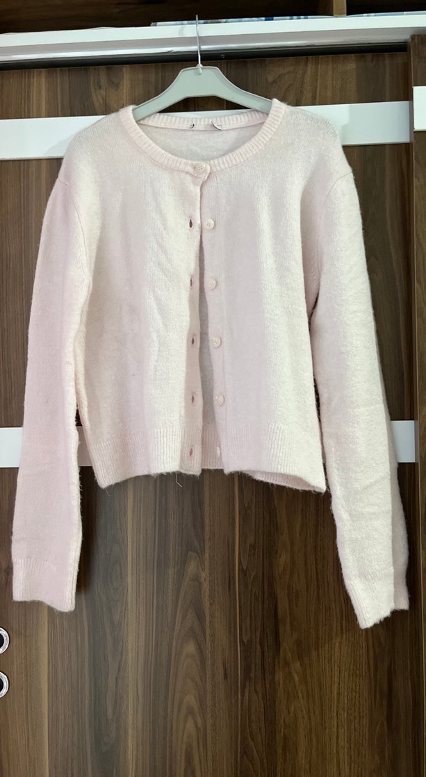 1 kere giyildi Açık pembe renkli, düğmeli ve crew yaka uzun kollu bir hırkadır. Rahat kesimli ve yumuşak, sıcak tutan bir kumaştan yapılmıştır.