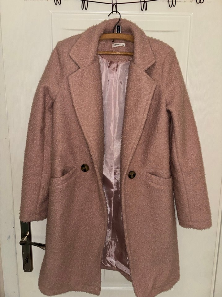 Pembe yün kaban, düğmeli ön, kırışık yakalı ve uzun kolludur. Normal kesim ve midi boyda, günlük kullanım için uygundur. Desensiz pastel tasarımıyla rahat bir sokak stili sunar.