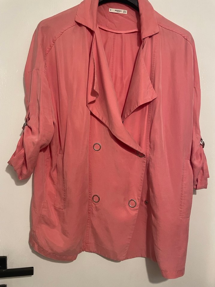 Pembe keten kumaştan, düğmeli ve kesimli yakalı, uzun kollu, midi boy, rahat kesim kadın ceket. Günlük kullanıma uygundur.