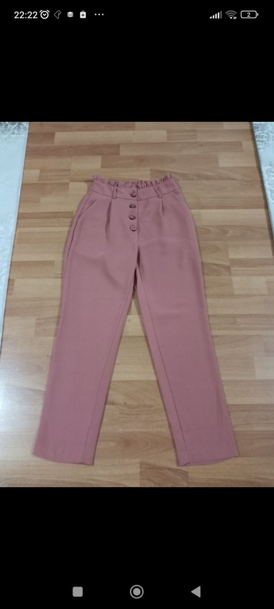 Düğmeli, normal boy midi pembe kadın kumaş pantolon. Rahat kalıp ve günlük kullanım için uygun, yumuşak sentetik kumaştan üretilmiştir.