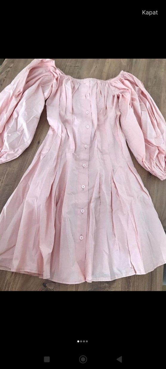Pembe midi elbise, uzun kollu ve tekne yaka ile düğmeli ön tasarıma sahiptir. Yumuşak keten kumaştan, bol kesim ve bohem tarzda üretilmiştir. Günlük kullanım için uygundur.
