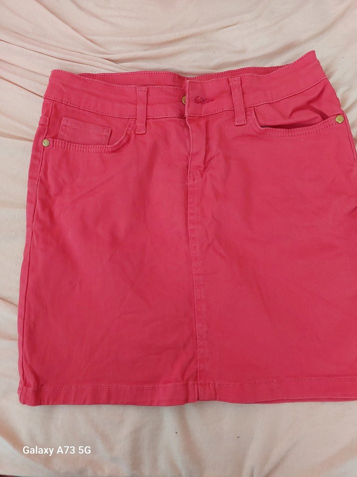 Düğmeli, sentetik kumaştan yapılmış, pembe renkli, fitted kesim mini etek, günlük rahat kullanıma uygun.