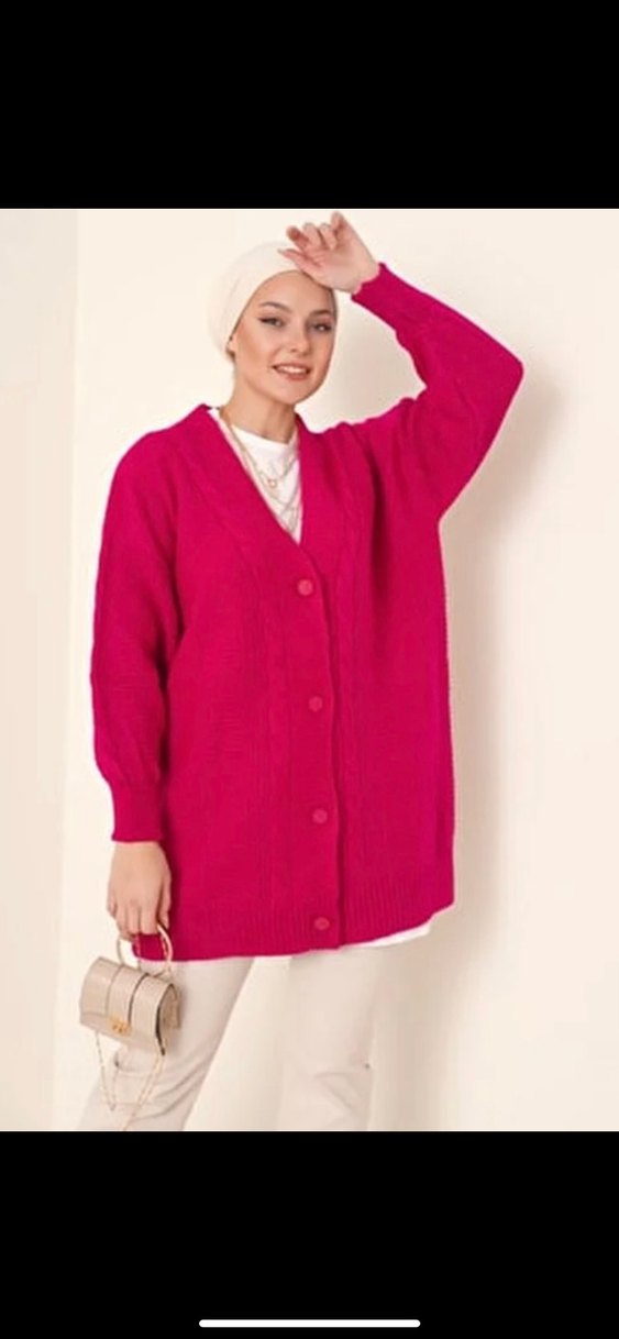 Açık pembe renkte, düğmeli, V yaka, uzun kollu, midi boy, bol kesim triko hırka.