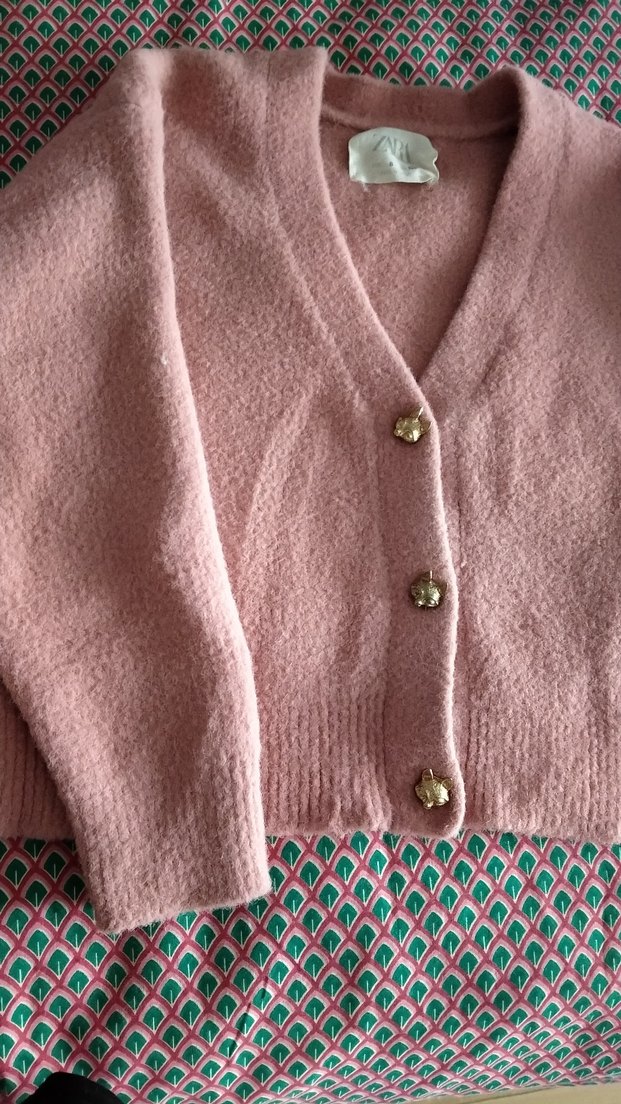 Düğmeli, pembe triko hırka, notched lapel yakalı, uzun kollu ve bol kesimdir. Midi boyda, rahat ve günlük kullanıma uygundur.