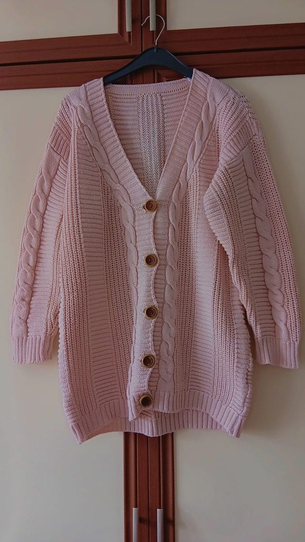 Düğmeli, uzun kollu, V yaka pembe triko hırka. Rahat kesimli, midi boyda, bohem tarzda, günlük kullanıma uygun.