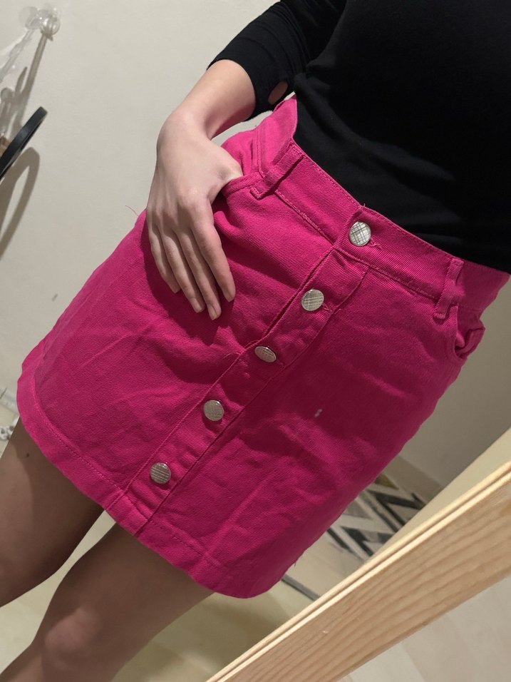 Düğmeli ön kısmı ve sentetik kumaşıyla pembe, dar kesim mini etek. Günlük kullanım ve sokak tarzına uygundur.