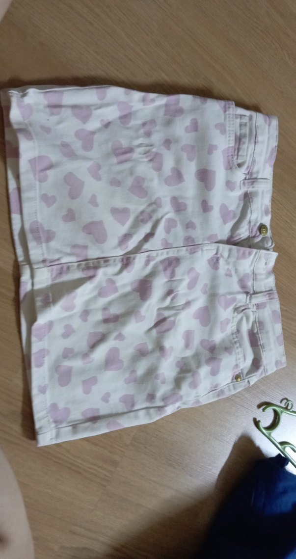 Düğmeli, bol kesim, pembe mini etek, yumuşak sentetik kumaştan, pastel kalp desenli. Rahat sokak stili için uygun. Kamerada soluk çıkmış ama normalde kalpleri canlı bir pembe