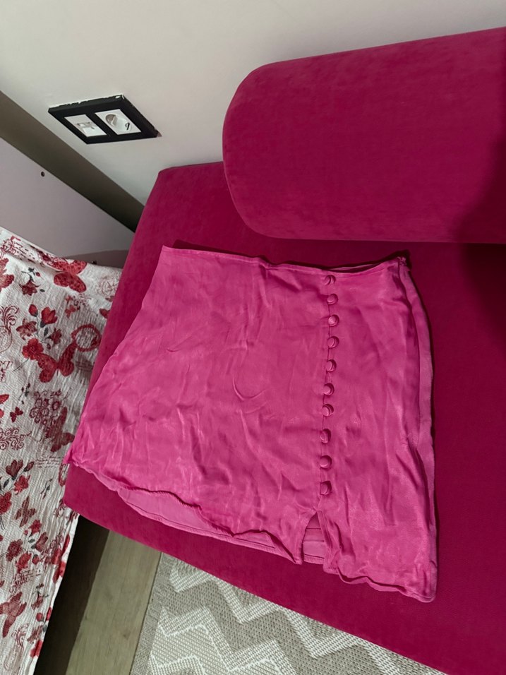 Düğmeli, pembe pastel renkte, sentetik kumaştan yapılmış, vücuda oturan kısa mini etek.