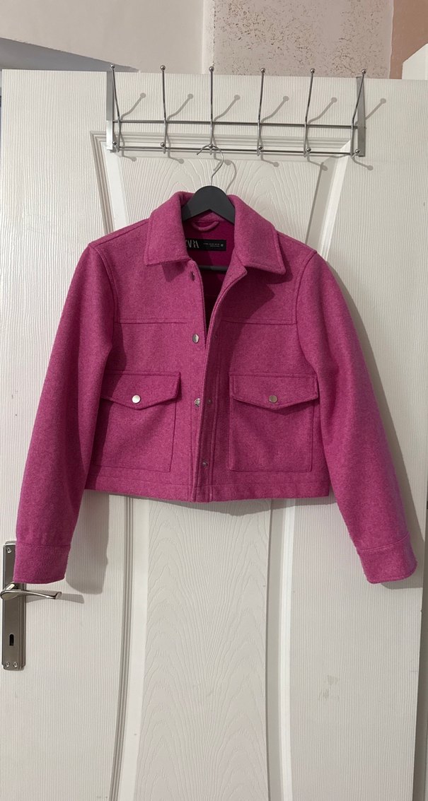 Düğmeli önü ve kesik yaka detayıyla, yumuşak ve sıcak kumaştan üretilmiş kısa pembe kaban. Regular fit, uzun kollu, rahat sokak stili için uygun.