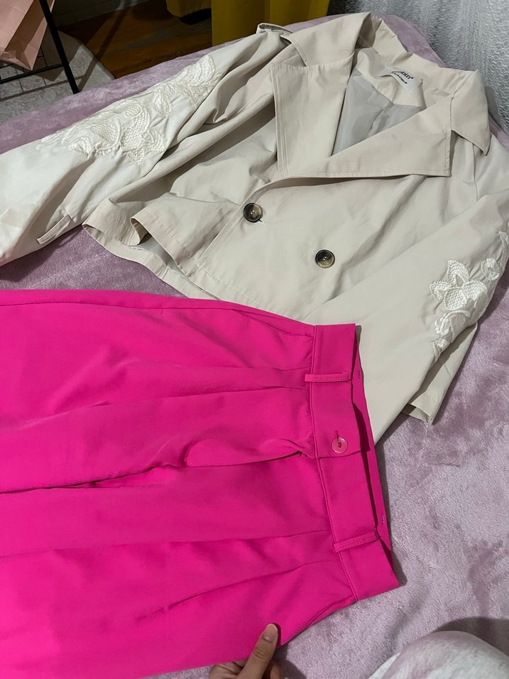 Düğmeli Pembe Mini Kadın Kumaş Pantolon ve trençkot
