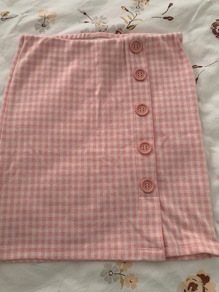 Düğmeli, pastel pembe kareli desenli, yumuşak sentetik kumaştan yapılmış, midi uzunlukta ve dar kesim mini etek.