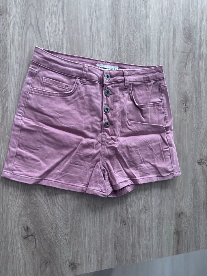 Düğmeli, pamuklu, pembe renkli, bol kesim mini şort. Günlük rahat sokak stili için uygundur.