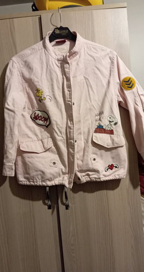 Pamuklu, düğmeli, uzun kollu, bol kesim pembe ceket. Nakışlı çizgi film desenleri ve kesimli yakasıyla günlük kullanıma uygun.