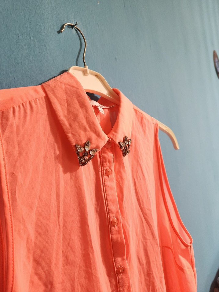 Düğmeli önü ve yakası bulunan, kolsuz, bol kesim pembe gömlek. Parlak nakış detaylarıyla minimalist sokak tarzı sunar. Günlük kullanım için uygundur.