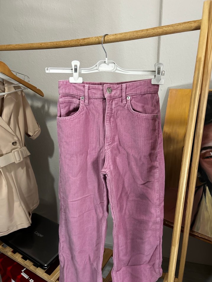Düğmeli, normal boy kesim pembe keten pantolon, hafif batik desenli, günlük rahat kullanım için uygundur.