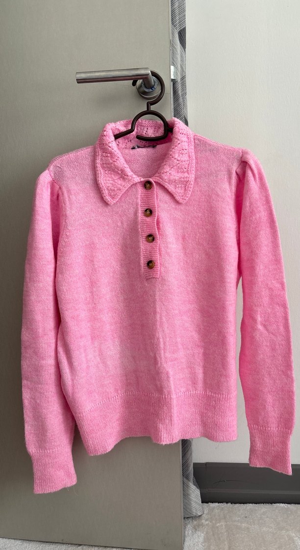 Pembe renkli, düğmeli ve yakalı uzun kollu örgü kazak. Rahat kesimi ve pastel tonu ile günlük kullanıma uygundur.