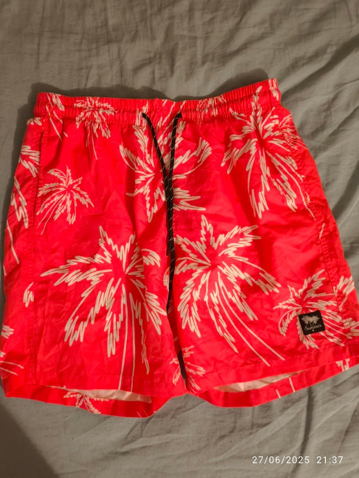 Düğmeli, bol kesim pembe palmiye desenli erkek mayo şortu. Canlı renkleriyle plajda rahat kullanım sağlar. ️