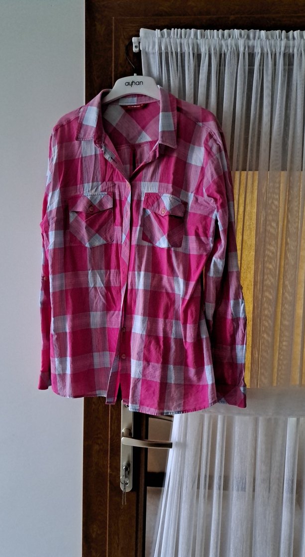Düğmeli ön kısım, uzun kollu ve yakalı, pamuklu pembe gömlek. Rahat kesimi ve batik desenli, günlük kullanıma uygun.