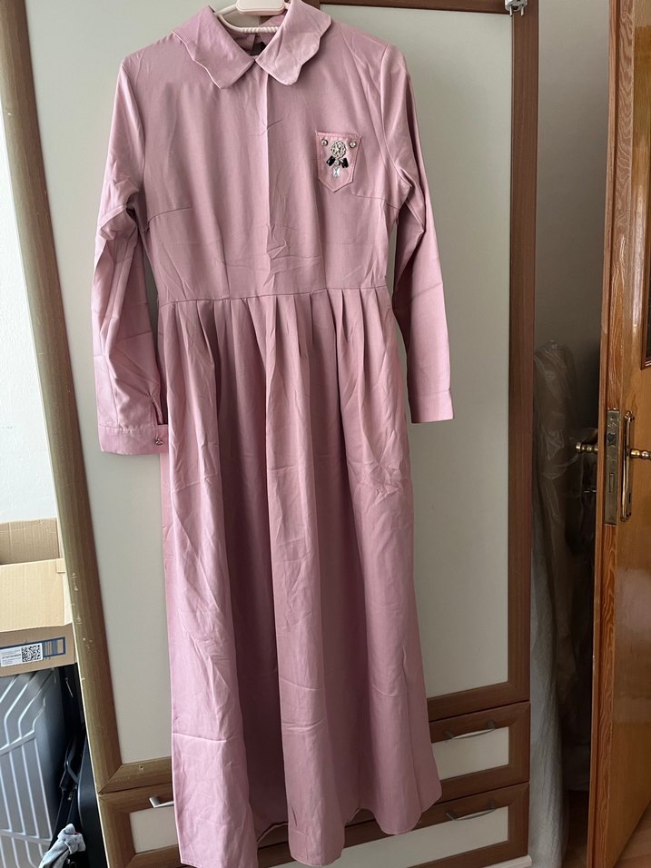 Pamuklu kumaştan, düğmeli ve yakalı, işlemeli detaylara sahip bol kesim uzun elbise. Günlük kullanıma uygun minimal tarzda. İki kere giyildi