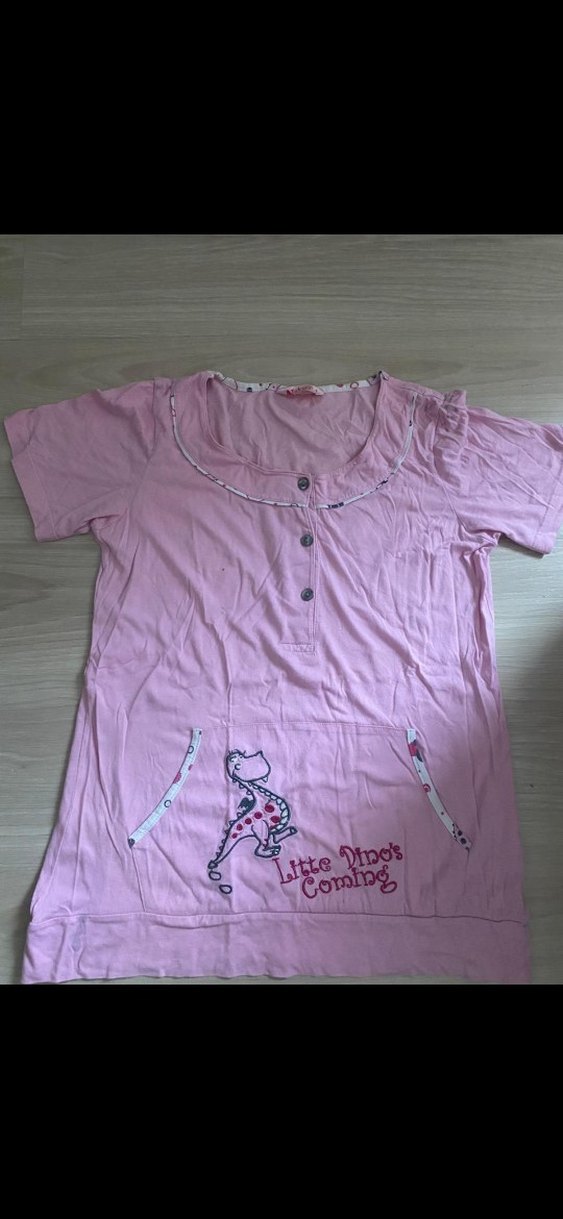 Pembe renkte, pamuklu kumaştan kısa kollu, yuvarlak yakalı ve bol kesim Düğmeli ve "Little Nine's Coming" yazılı baskılı detaylar içerir. kol üstünde biraz leke var 36/38 uyumlu