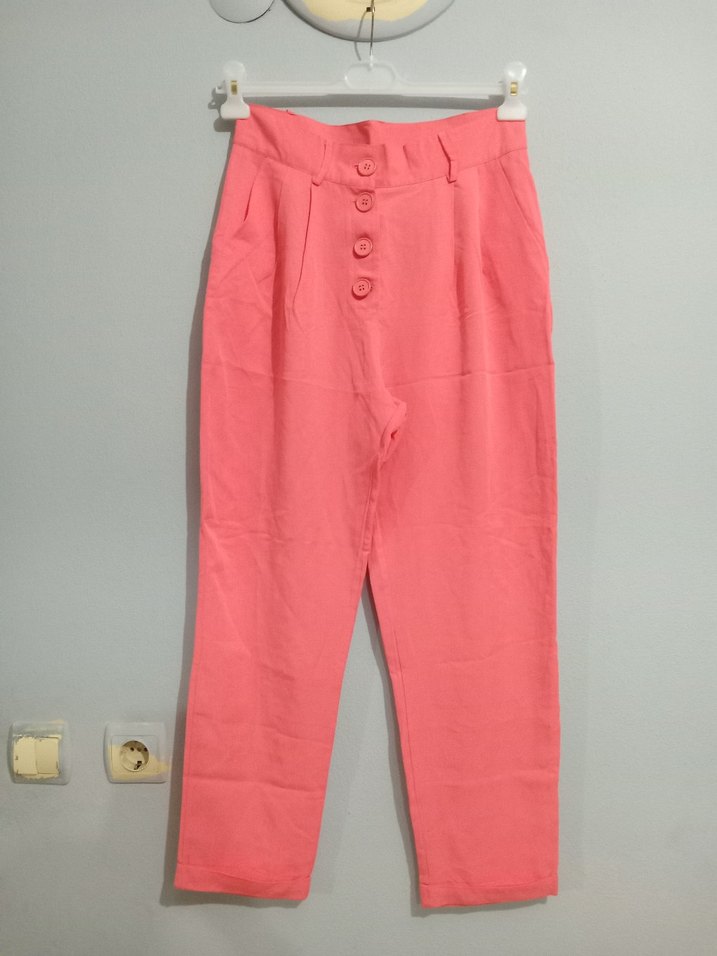 Düğmeli ön kısmı ve pastel pembe rengiyle bol kesim kadın pantolon. Midi boyda, sentetik ve yumuşak kumaştan, günlük rahat sokak stili için uygun.