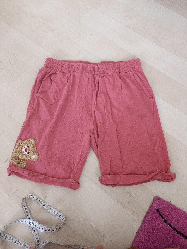 Düğmeli detaylara sahip, cepli ve yumuşak, sıcak kumaştan yapılmış pembe rahat kız şortu. Küçük ayıcık desenli.