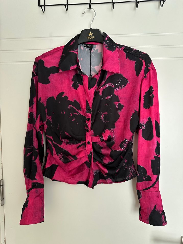 Düğmeli Pembe Siyah Batik Desenli Kadın Saten Gömlek