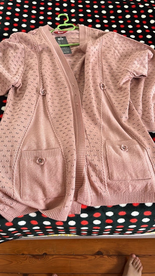 Pembe renkli triko, düğmeli, normal midi boy, uzun kollu, notched lapel yakalı, rahat kesim kadın hırkası. Günlük kullanıma uygun, konforlu ve şık.