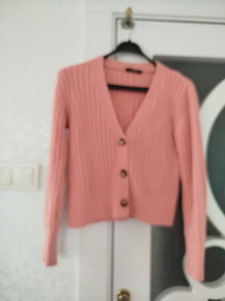 Düğmeli, V yakalı, uzun kollu ve fitted kesimli pembe triko kadın hırka, günlük kullanıma uygundur.