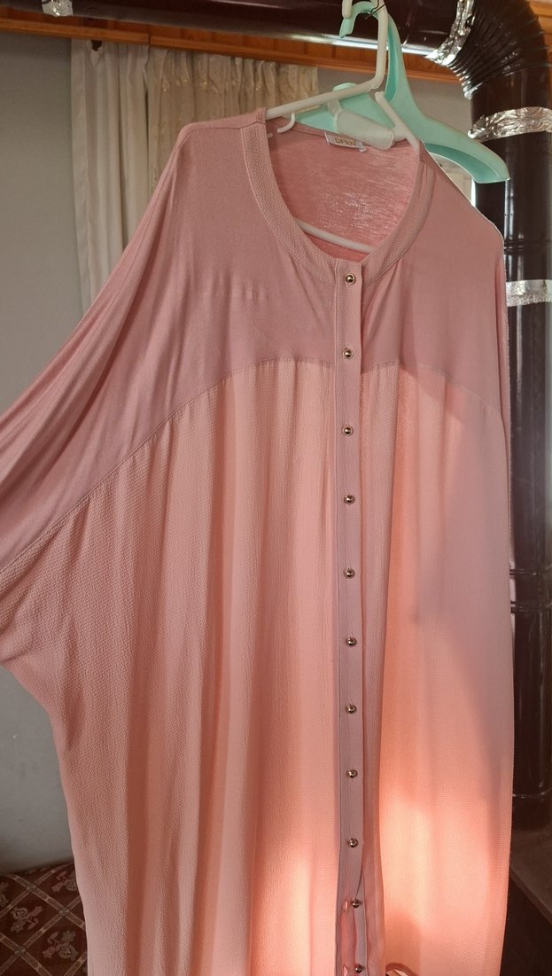 Düğmeli, uzun kollu, V yaka, bol kesim pembe hamile bluzu. Yumuşak sentetik kumaştan, günlük kullanım için uygundur.