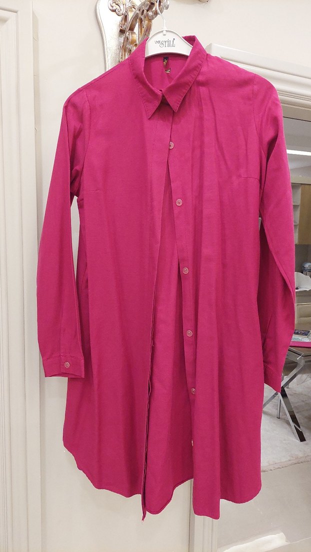 Uzun kollu, düğmeli, notched lapel yakalı, bol kesim, parlak pembe, ipeksi kumaştan yapılmış tunik, ofis için uygundur.