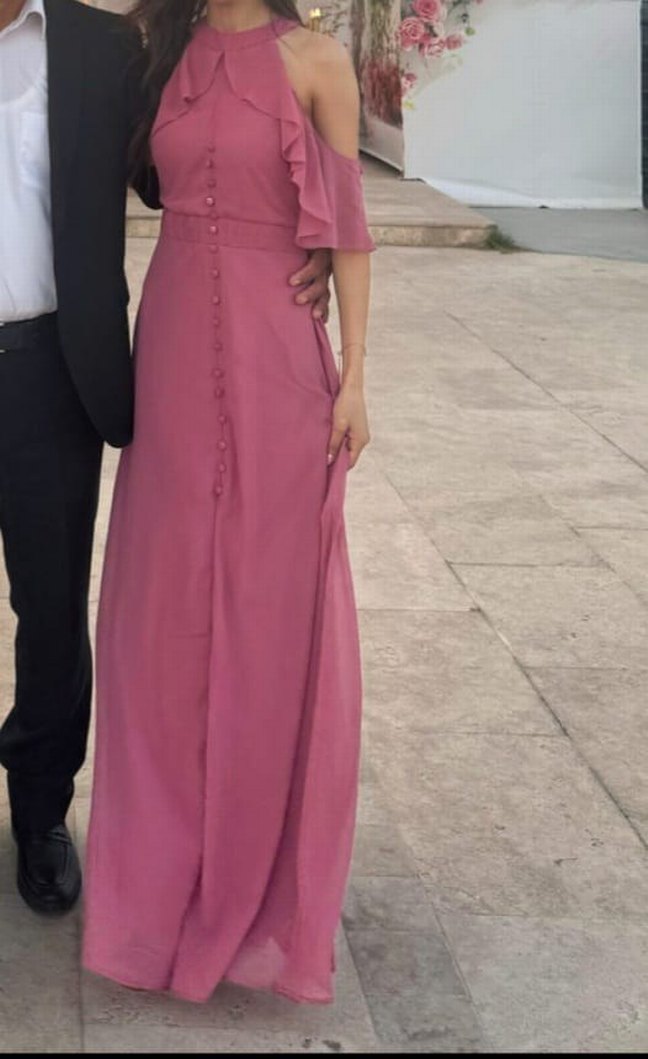 Düğmeli, pembe renkte, ipeksi kumaştan uzun elbise. Notlu yaka ve ince askılı kollara sahip, klasik ve modern tarzda düğünlere uygun. Bir defa giyildi hiç bir sıkıntısı yok
