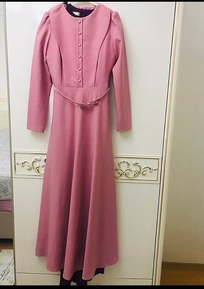 Düğmeli, yakalı ve uzun kollu pembe uzun elbise. Sentetik kumaştan, klasik kesim ve ofis kullanımı için uygun. Ikı koltuk arası 45