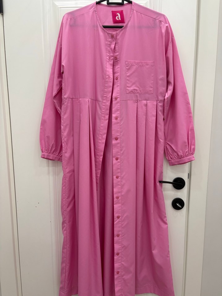 Düğmeli ön kısmı ve kesik yakasıyla bol kesim, uzun kollu kadın elbisesi. Pastel pembe, yumuşak sentetik kumaştan, minimal ve desensiz tasarım. Günlük kullanıma uygun normcore stil.