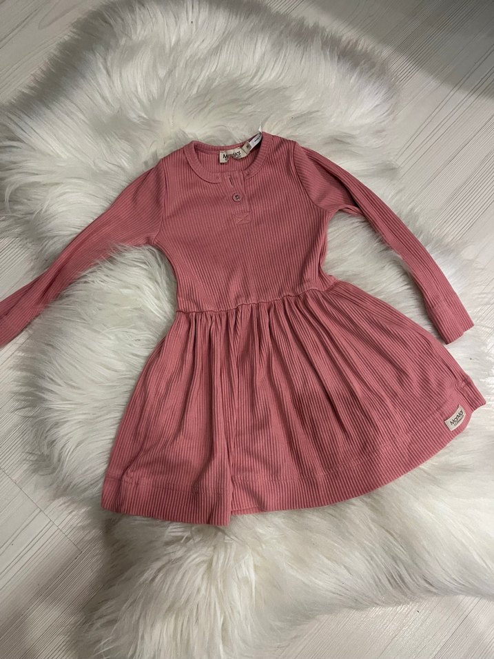 Pembe renkli, düğmeli ve uzun kollu kız elbisesi. Yuvarlak yaka ve bol kesimle rahat bir kullanım sunar, yumuşak ve sıcak kumaştan üretilmiştir.