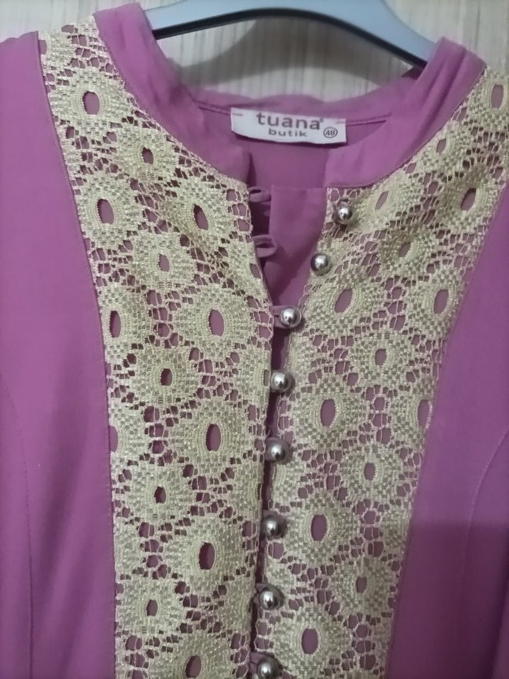 Düğmeli Pembe Uzun Kollu Nakışlı elbise