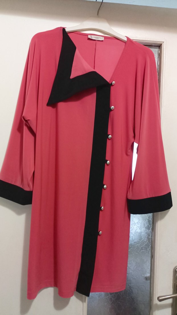 Düğmeli ön ve kesik yakalı uzun pembe tunik, siyah detaylıdır. İpek gibi parlak kumaştan, bol kesim ve uzun kolludur. günlük kullanima uygundur.