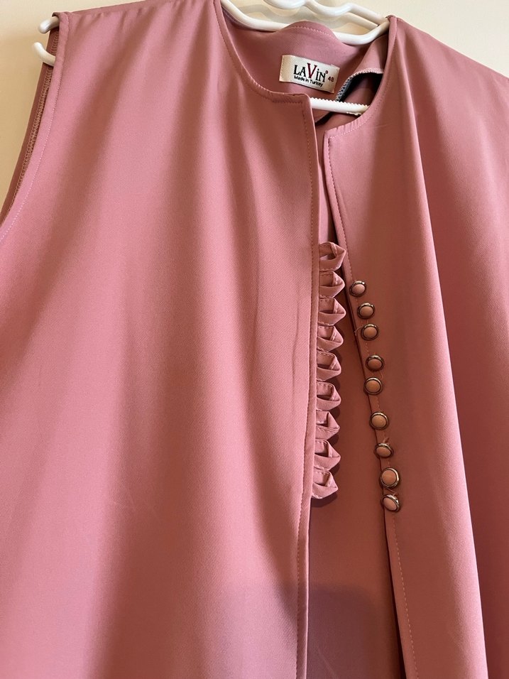 Düğmeli, yakalı ve uzun kesime sahip pembe yeleği. Kolsuz ve bol kesimli, ipeksi dokuda, günlük kullanıma uygun.