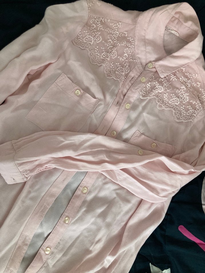 Düğmeli, yakalı ve uzun kollu pembe gömlek. İpek gibi kumaştan, vintage bohem tarzda dantel detaylı. Rahat kesim ve midi boyda, desensiz.