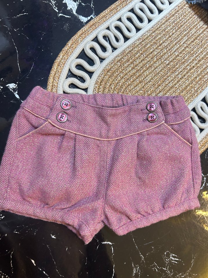 Düğmeli, pembe yün kumaştan yapılmış vintage tarzda, bol kesim kız şortudur. Renkli ve rahat bir görünüme sahiptir.