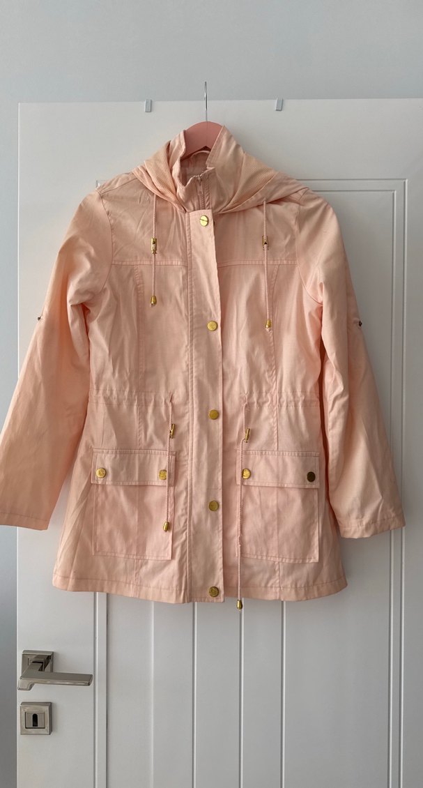 Düğmeli ve yakası kesimli, pastel pembe yağmurluğu. Sentetik kumaştan üretilmiş, regular fit ve sokak stiline uygun. Beklemeye bağlı düğmelerde hafif renk değişimi ve mağaza ürünü olduğu için hafif leke var ama yıkanma ile geçer ürün sıfır olduğu için yıkanmadı alındı giyilmedi