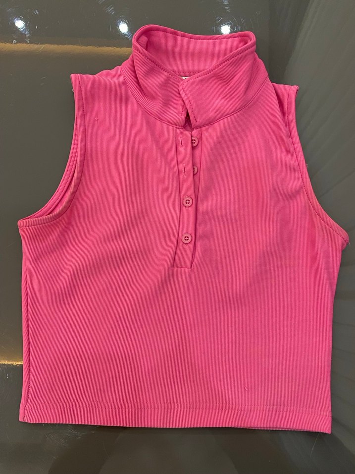 Düğmeli Pembe Yüksek Yakalı crop