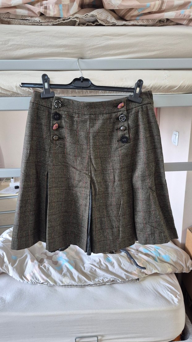Düğmeli, kahverengi kısa eteği yün kumaştan, bol kesim ve vintage sokak tarzı ile ofis kullanımı için uygundur.