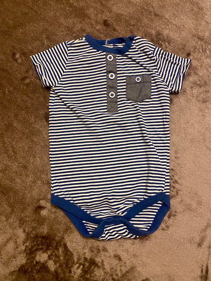Pamuklu kısa kollu erkek bebek body, polo yaka ve düğmeli ön kısmıyla. Çizgili desen ve küçük cep detayıyla rahat sokak stili. 3-6 ay