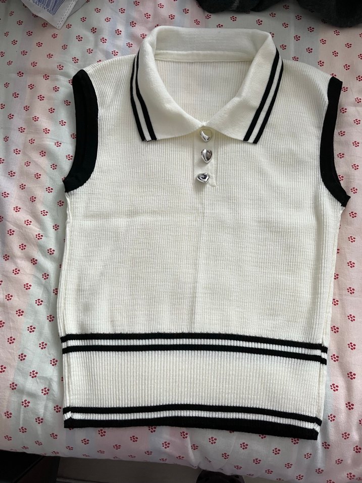 Düğmeli polo yaka, pamuklu ve örme kumaştan, beyaz ve siyah detaylı, fitted kesim kadın süveter. Günlük rahat sokak stiline uygundur.