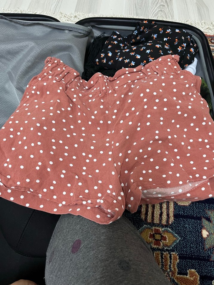 Düğmeli ve puanlı koyu pembe pamuklu mini şortu, rahat ve günlük kullanım için uygundur.