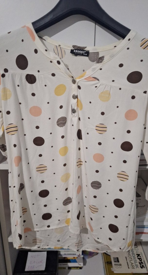 Beyaz, kısa kollu, düğmeli ve V yaka bluz. Hafif sentetik kumaştan, bol kesim ve renkli puantiyeli desene sahip. Günlük kullanıma uygun.