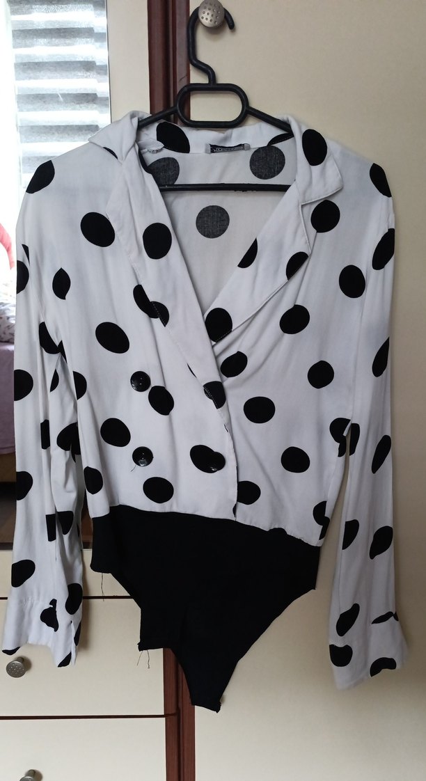Uzun kollu, V yakalı ve düğmeli ön kısma sahip bol kesim bluz. Beyaz zemin üzerine büyük siyah puantiyelerle, yumuşak sentetik kumaştan üretilmiştir.